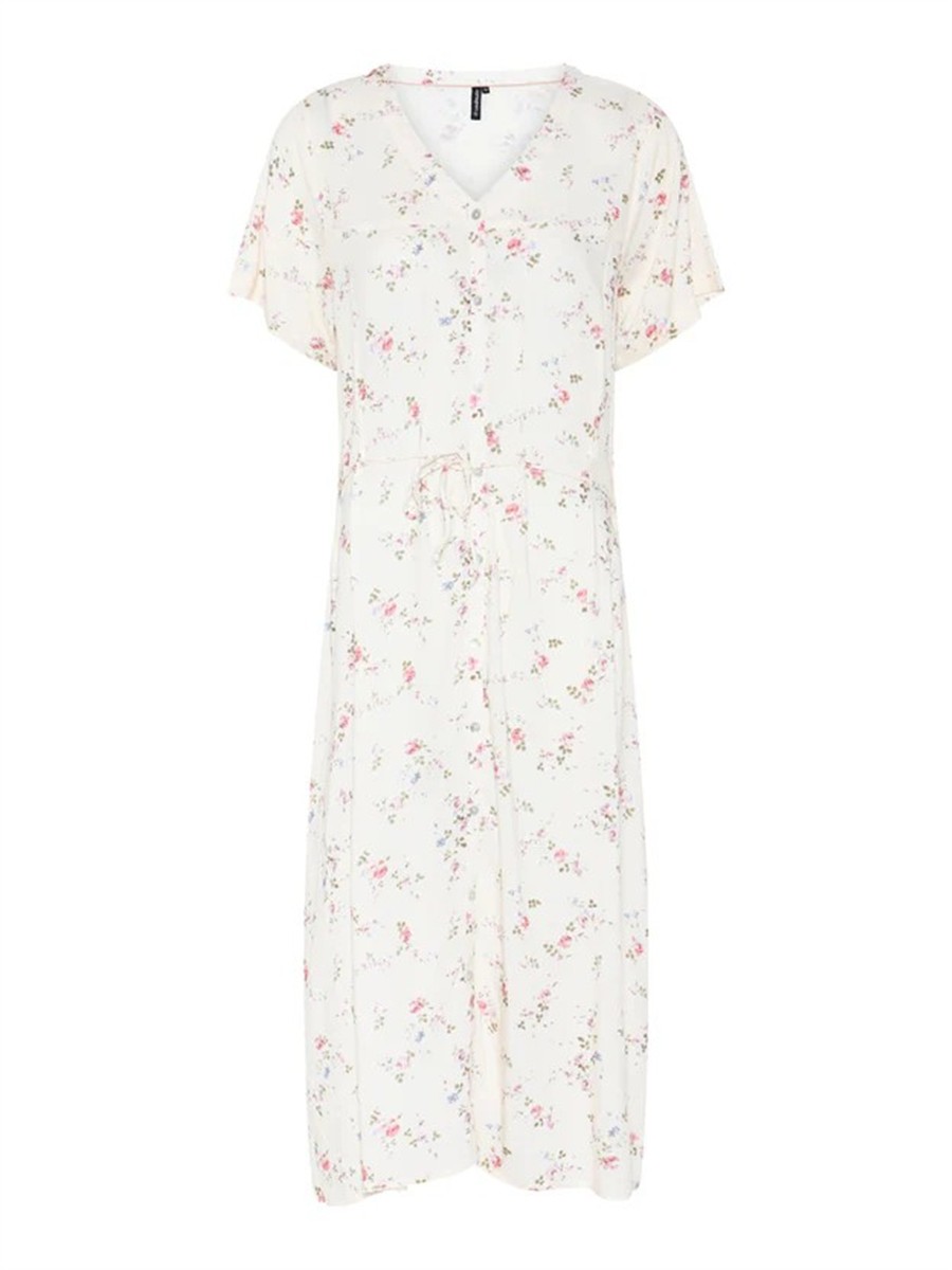 Sød blomstret kjole med v-hals og kort ærme. Kjolen er gennemknappet, med lommer og har bindebånd i taljen. Dejlig luftig style som falder flot.