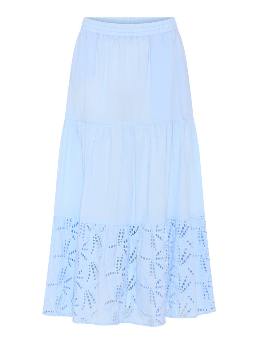 Lang feminin nederdel med elastik i taljen, et behageligt fit og flæsestykke i bunden. Nederdelen har lommer i siderne.