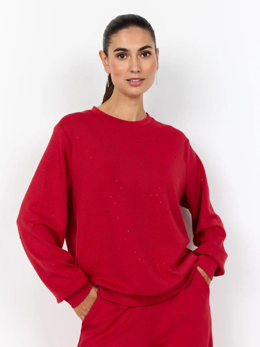 Blusen har klassisk rund halsudskæring med ribbede manchetter og små glitterende sten på hele frontstykket.