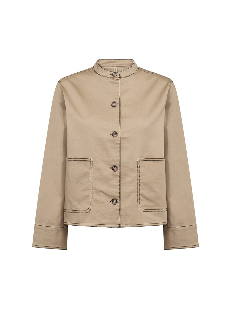 Denne Soya Concept jakke er fremstillet af 65% bomuld, 33% polyester og 2% elastan. Den har mandarinkrave, knaplukning foran og to forlommer med fremtrædende syningsdetaljer.