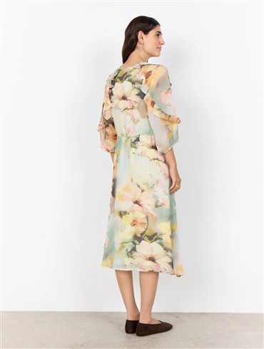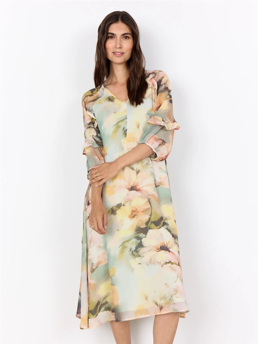 Kjolen fra Soya Concept er fremstillet af 100 % genbrugspolyester. Kjolen har et blødt blomsterprint, en flatterende V-hals og charmerende flæsedetaljer på ærmerne.