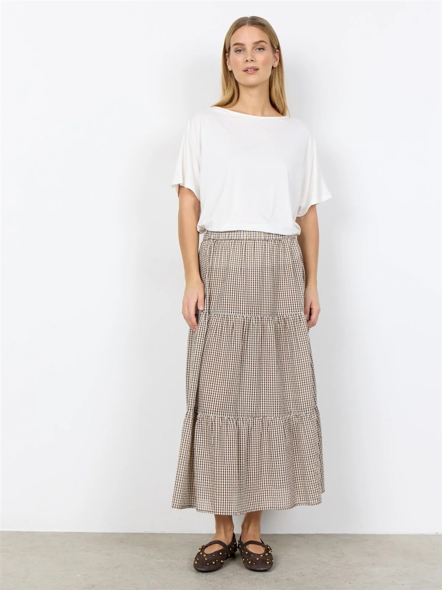 Nederdelen har et lagdelt design med en blød, flydende tekstur og et smart ternet print.